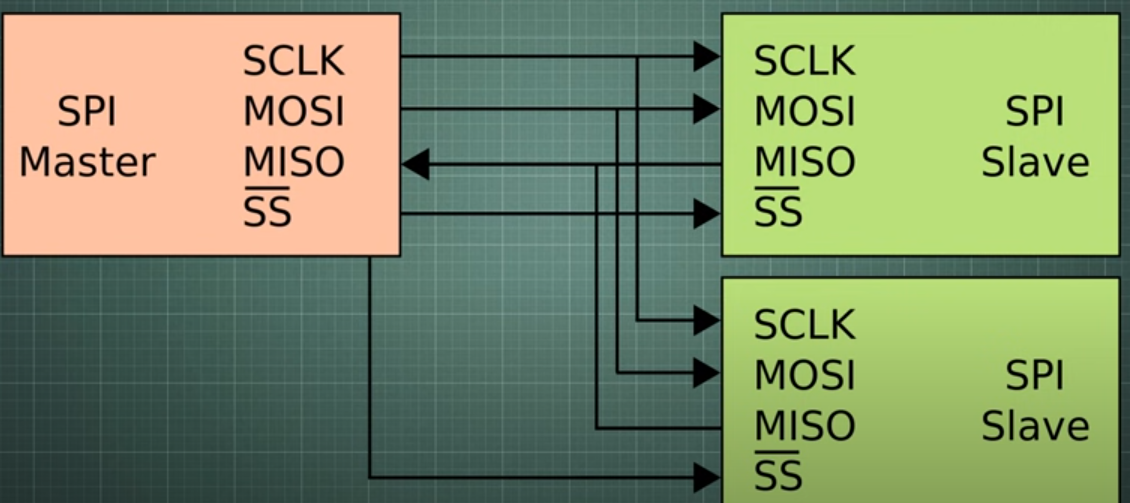 - I2C처럼 slave address가 없는 대신 slave device 갯수만큼 master 쪽에 CS 핀을 연결한다. 한 번에 한 slave 하고만 통신할 수 있는 대신 full duplex 가 가능하다. (주는것 MOSI로만, 받는건 MISO로만 하기 때문)